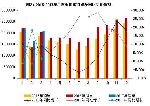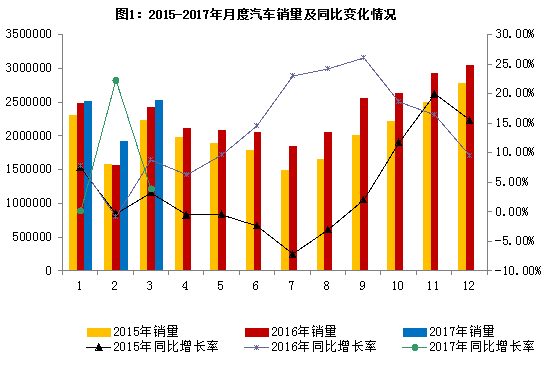 2017年3月,汽车产销环比呈较快增长。1-3月,汽车产销保持稳定增长,产销增幅比上年同期均呈小幅提升。 一、3月汽车销量同比增长4.0% 3月,汽车生产260.4万辆,环比增长20.6%,同比增长3.0%;销售254.3万辆,环比增长31.1%,同比增长4.0%。 1-3月,汽车产销分别完成713.3万辆和700.2万辆,同比分别增长8.0%和7.0%,总体表现良好。