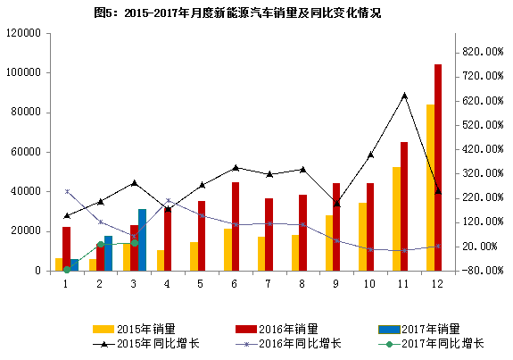 二、3月新能源汽车销售同比增长35.6% 3月,新能源汽车产销分别完成33.0万辆和31.1万辆,同比分别增长30.9%和35.6%。其中纯电动汽车产销均为2.4万辆,同比分别增长113.1%和120.7%;插电式混合动力汽车产销分别完成0.53万辆和0.48万辆,同比分别下降11.9%和3.9%。 1-3月,新能源汽车生产5.8万辆,销售5.6万辆,同比分别下降7.7%和4.7%。其中纯电动汽车产销分别完成4.8万辆和4.4万辆,同比分别增长2.9%和4.4%;插电式混合动力汽车产销分别完成1.0万辆和1.2万辆,同比分别下降37.5%和28.4%。