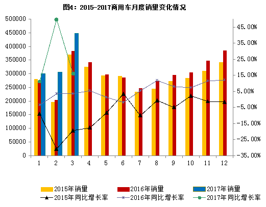 2.中国品牌乘用车市场持续增长 3月,中国品牌乘用车共销售95.7万辆,同比增长7.3%,占乘用车销售总量的45.6%。 1-3月,中国品牌乘用车累计销售272万辆,同比增长6.5%,占乘用车销售总量的45.7%;其中轿车销量57.1万辆,同比增长1.9%,市场份额20.1%;SUV销量148.8万辆,同比增长28.9%,市场份额62.4%;MPV销量49.3万辆,同比下降20.6%,市场份额89.0%。 (二)3月商用车销售同比增长16.2% 3月,商用车产销量继续保持较快增长,产销分别完成41.6万辆和44.7万辆,环比分别增长33.3%和45.7%,同比分别增长10.2%和16.2%。 1-3月,商用车产销累计分别完成102.6万辆和105.4万辆,同比分别增长15.4%和22.9%。分车型产销情况看,客车产销同比分别下降22.5%和21.1%;货车产销同比分别增长了21.4%和30.1%,货车产销量继续较快增长。