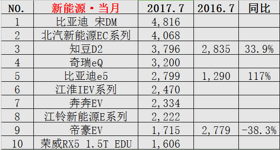 根据以上数据,可以计算出2017年前七个月,新能源乘用车在整个乘用车市场所占比例: 19.49万辆÷1223.93万辆=1.6% 1.6%是个什么概念呢? 据EV Sales发布的数据显示,今年6月份全球电动车市场份额首次突破1%。 也就是说,中国7月新能源乘用车市场创造了1.6%的份额新高!! 三巨头依然实力强大 与6月比,7月新能源乘用车销量排行前十的车型有较大变化。比亚迪宋DM反超知豆D2成为7月新能源乘用车销量冠军,北汽新能源EC系列位列第二,知豆D2退居第三。吉利、广汽等车企加速推出插混车型,以期领先于合资品牌,实现普混产品的升级。