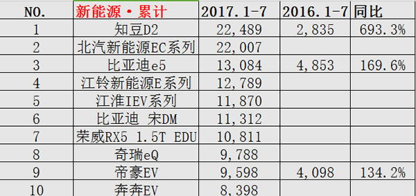 整个2017前七月,新能源销量前三还是在比亚迪、北汽新能源EC系列、知豆D2中,只不过顺序发生了改变,知豆D2延续上半年的优势,继续问鼎新能源乘用车销售宝座,北汽新能源EC系列、比亚迪e5仍然分别位列第二和第三。