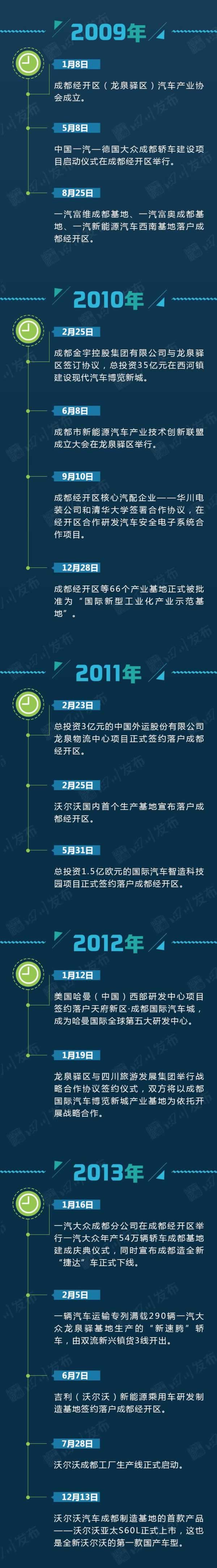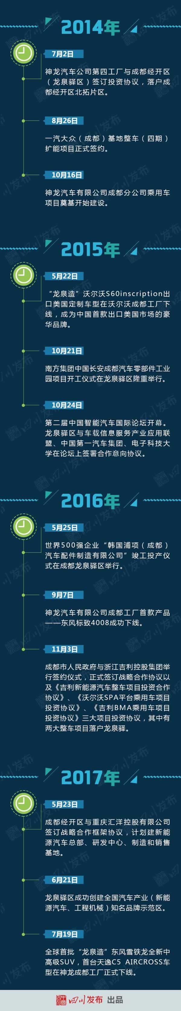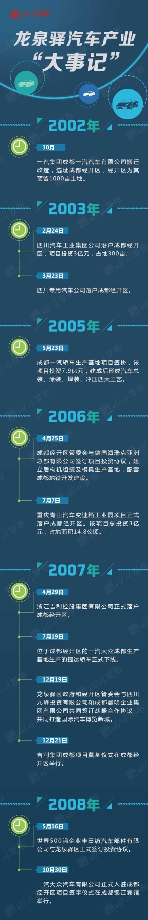 作为成都国家经济技术开发区所在地,龙泉驿被规划为高端制造产业功能带和高端制造产业功能区,其核心是以汽车研发制造为重点,打造万亿产值商圈。 目前,龙泉驿已聚集一汽大众、一汽丰田、东风神龙、沃尔沃、吉利等11家整车企业,300余个关键零部件项目,初步搭建年产140万台整车生产能力平台,成为西部地区第二大整车生产基地。相比2008年的1.6万,2016年龙泉驿整车产量达到111.6万辆,9年时间增长了69倍,正式迈入“百万级”。 2017年1-6月,“龙泉造”整车产量达59万辆,同比增长6.6万辆,增幅为12.6%,顺利实现“双过半”目标任务,再次刷新整车半年产量纪录,继续担当全省、全市制造业领头羊、排头兵。到2021年,龙泉驿将力争整车产量突破300万辆。 龙泉驿区十三五规划中提出,未来五年实现汽车产业主营业务收入3000亿元左右,龙泉驿将成为名副其实的汽车城。下面就跟着川叔的脚步一起,回首近十五年来龙泉驿汽车产业“大事记”,深入感受龙泉驿作为“大车都”的风采吧!