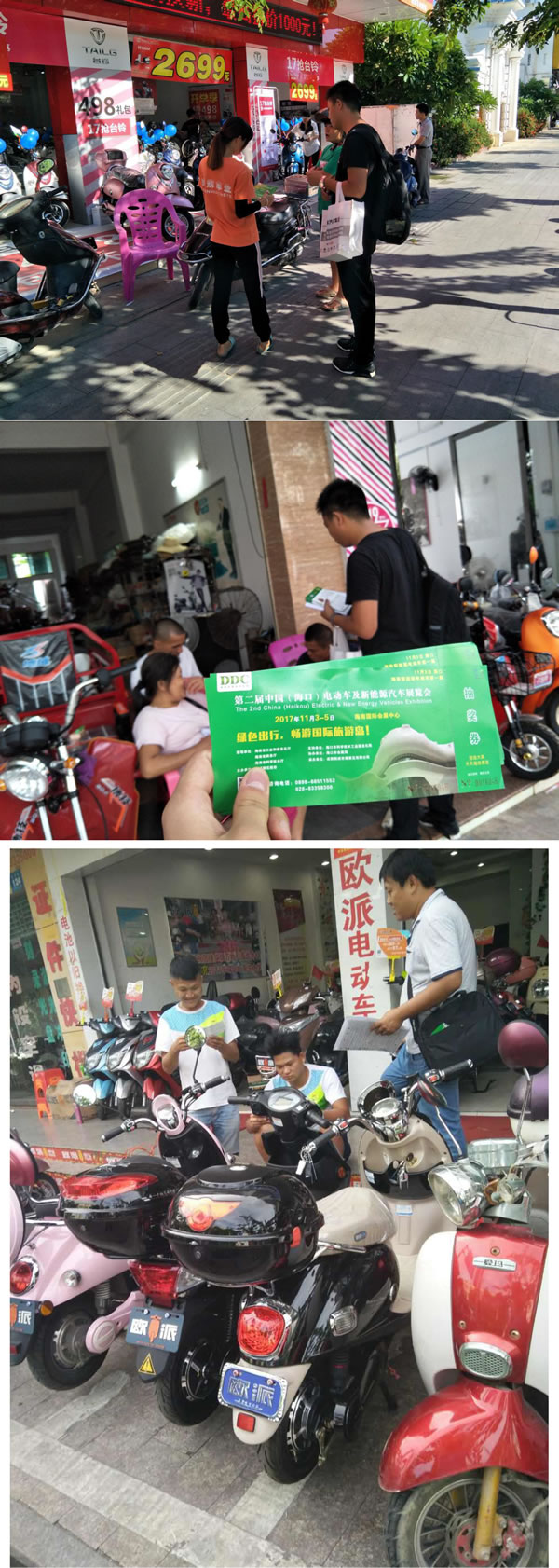 为保证企业的参展效果,向更多的经销商和专业采购团传递展会的详细信息,组委会在9月初就开始了专业观众的邀请活动,一是通过电话邀请数据库中的全国各地近10万家电动车厂家、经销商名录参观采购;二是派出10多名工作人员,行程5000多公里,上门走访海南省海口市、三亚市、儋州市3市,临高、昌江、东方、乐东、白沙、澄迈、安定、屯昌、琼中、五指山、保亭、文昌、琼海、万宁、陵水等14县及下属乡镇的3000多家电动车门店,邀请代理商、经销商参观、订货,多数经销商表示有意向届时到展会参观。