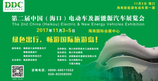 11月3-5日,在海南省发改委、海南省工信厅、海南省科技厅和海口市科学技术工业信息化局、海口市交通运输和港航管理局、海口市会展局等政府相关部门的指导和大力支持下,由振威展览股份主办、成都振威世展展览有限公司承办的第二届中国(海口)电动车及新能源汽车展览会将在海南国际会展中心举办。展会主要展示电动两轮车、电动三轮车、低速四轮车、高端新能源汽车、零配件及充电设备,展出面积30000平方米,预计将吸引300多家企业参展。