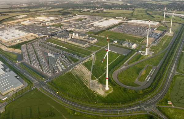 宝马莱比锡(Leipzig)工厂鸟瞰,几座标志性的风力发电机矗立在其周围。